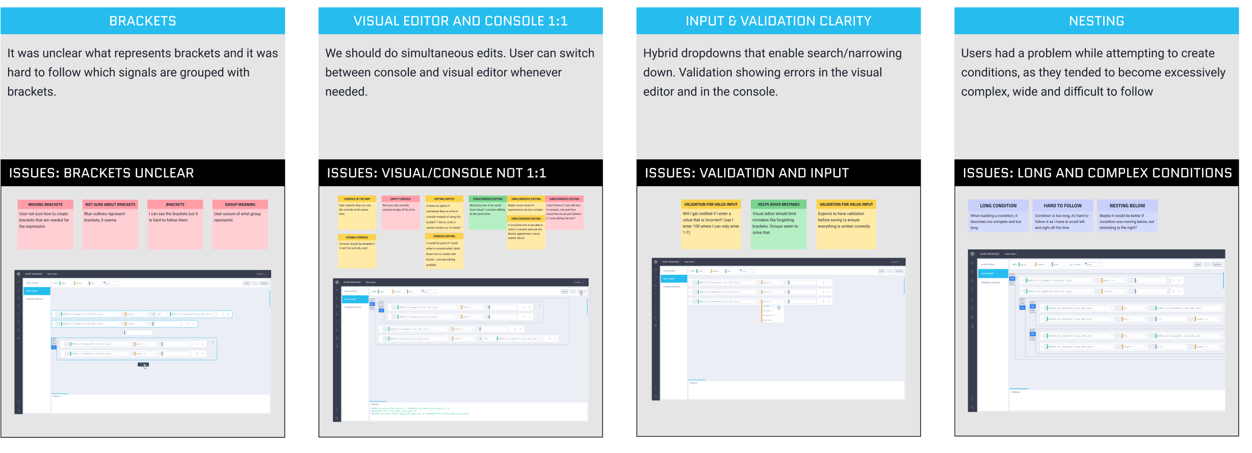 Alerts are notifications triggered by custom conditions based on logical operators and signal variables. However, creating Alert conditions required users to think like programmers. Non-technical users struggled to understand logical operators, brackets, and condition order, often creating invalid or overly complex rules without realizing it. The interface became hard to read as conditions grew longer, and there was little feedback when something went wrong. Users lacked confidence that their Alerts would behave as expected.